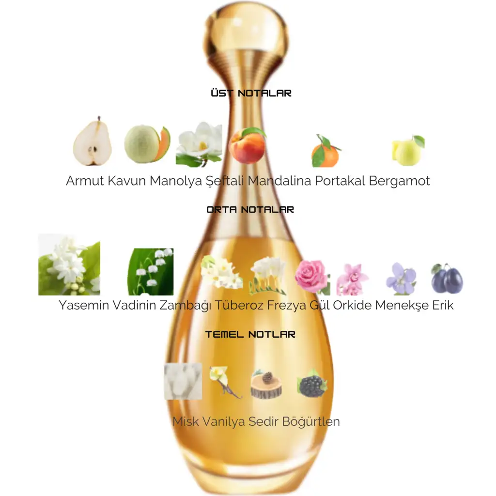 Dior'dan J'adore, kadınlar için Çiçeksi Meyveli bir koku. J'adore 1999 yılında piyasaya sürüldü. Bu kokunun arkasındaki burun Calice Becker'dir. Üst notalarda Armut, Kavun, Manolya, Şeftali, Mandalina ve Bergamot; orta notalarda Yasemin, Vadi Zambağı, Sümbülteber, Frezya, Gül, Orkide, Menekşe ve Erik; temel notalarda Misk, Vanilya, Sedir ve Böğürtlen bulunur. Bu parfüm, FiFi Ödülü En iyi Ulusal Reklam Kampanyası / TV 2007 ödülünün sahibidir.
