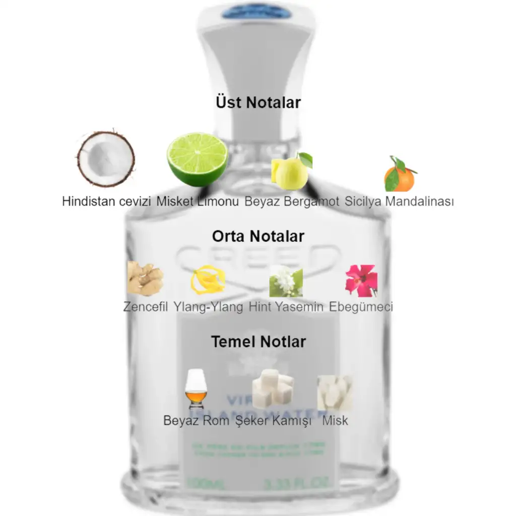 Virgin Island Water by Creed, kadınlar ve erkekler için Narenciye kokusudur. Virgin Adası Suyu 2007 yılında piyasaya sürüldü. Virgin Adası Suyu Olivier Creed ve Erwin Creed tarafından yaratılmıştır. Üst notalar Hindistancevizi, Misket Limonu, Beyaz Bergamot ve Sicilya Mandalinasıdır; orta notalar Zencefil, Ylang-Ylang, Hint Yasemini ve Ebegümecidir; temel notalar Beyaz Rom, Şeker Kamışı ve Misktir.