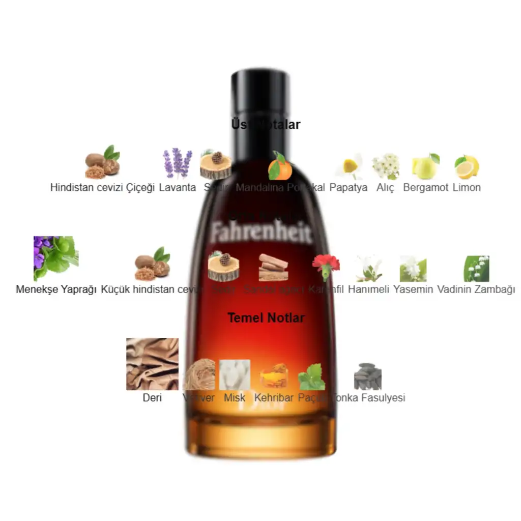 Fahrenheit by Dior, erkekler için Aromatik bir Fougere kokusudur. Fahrenheit 1988'de piyasaya sürüldü. Fahrenheit, Jean-Louis Sieuzac, Michel Almairac ve Maurice Roger tarafından yaratıldı. Üst notalarda Hindistan cevizi Çiçeği, Lavanta, Sedir, Mandalina, Papatya, Alıç, Bergamot ve Limon; orta notalarda Menekşe Yaprağı, Hindistan cevizi, Sedir, Sandal Ağacı, Karanfil, Hanımeli, Yasemin ve Vadi Zambağı; temel notalarda Deri, Vetiver, Misk, Kehribar, Paçuli ve Tonka Fasulyesi.